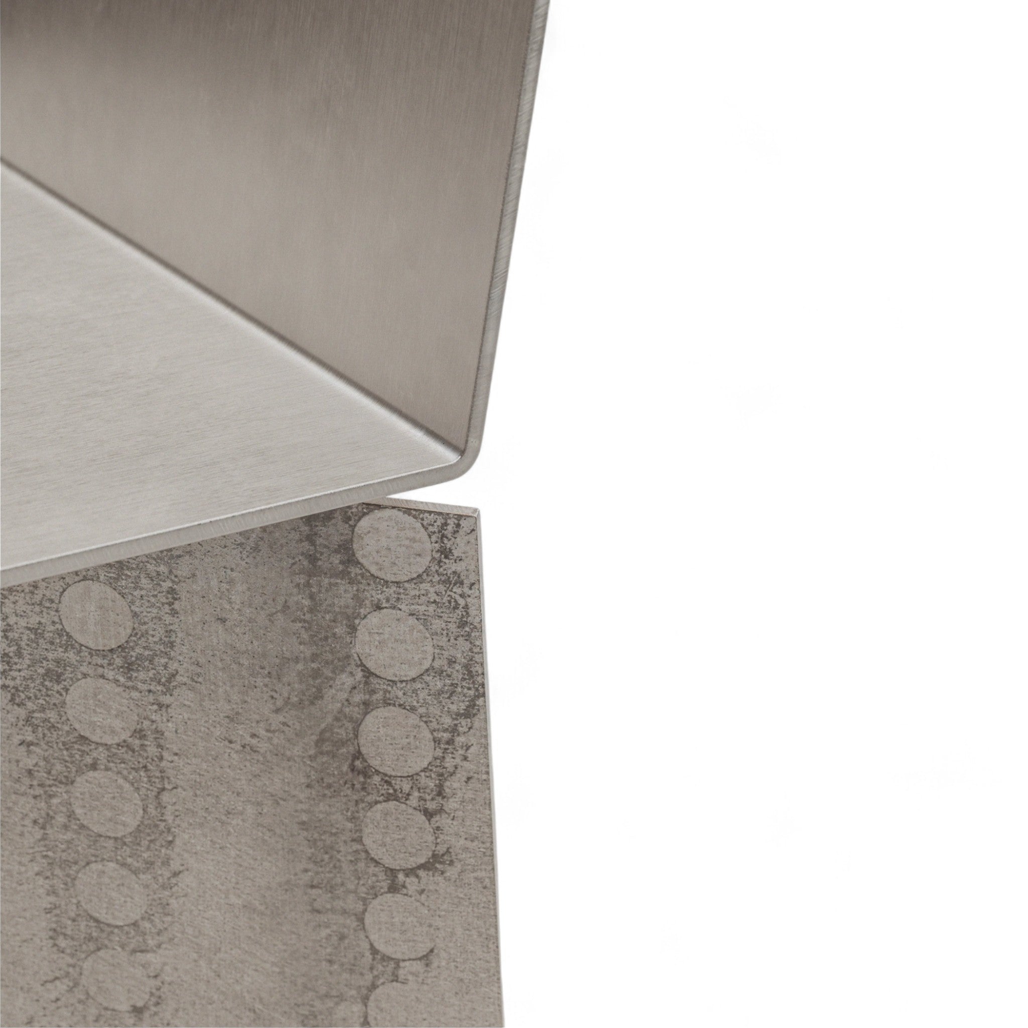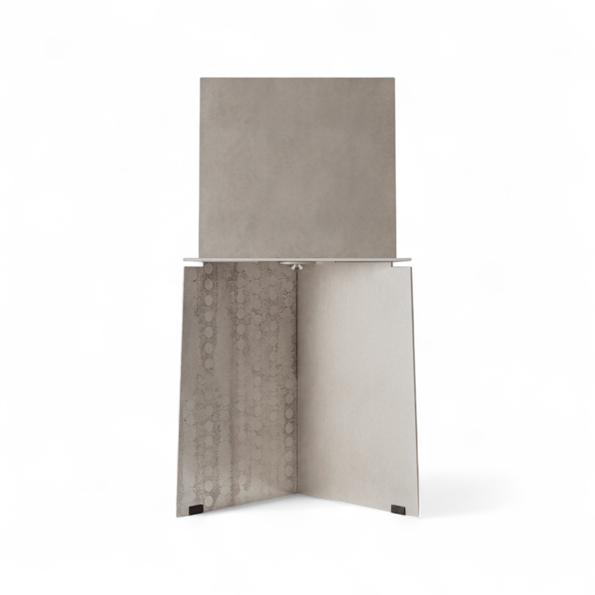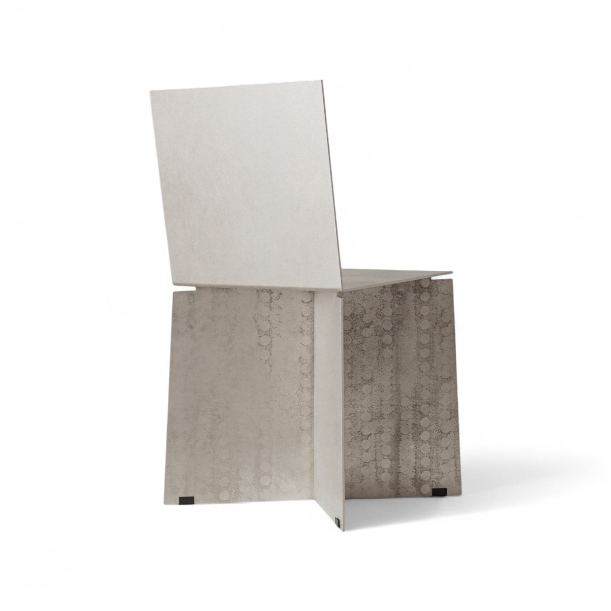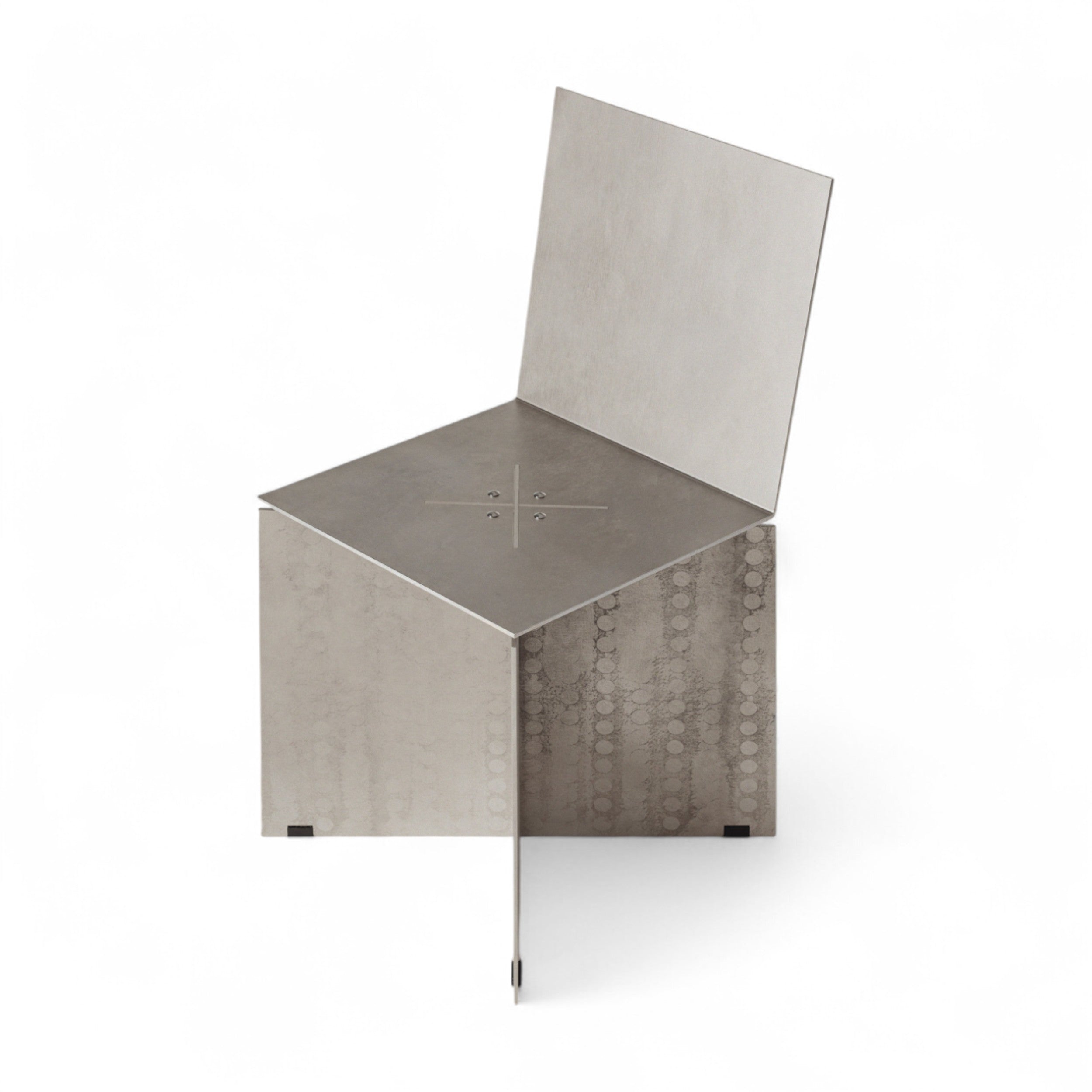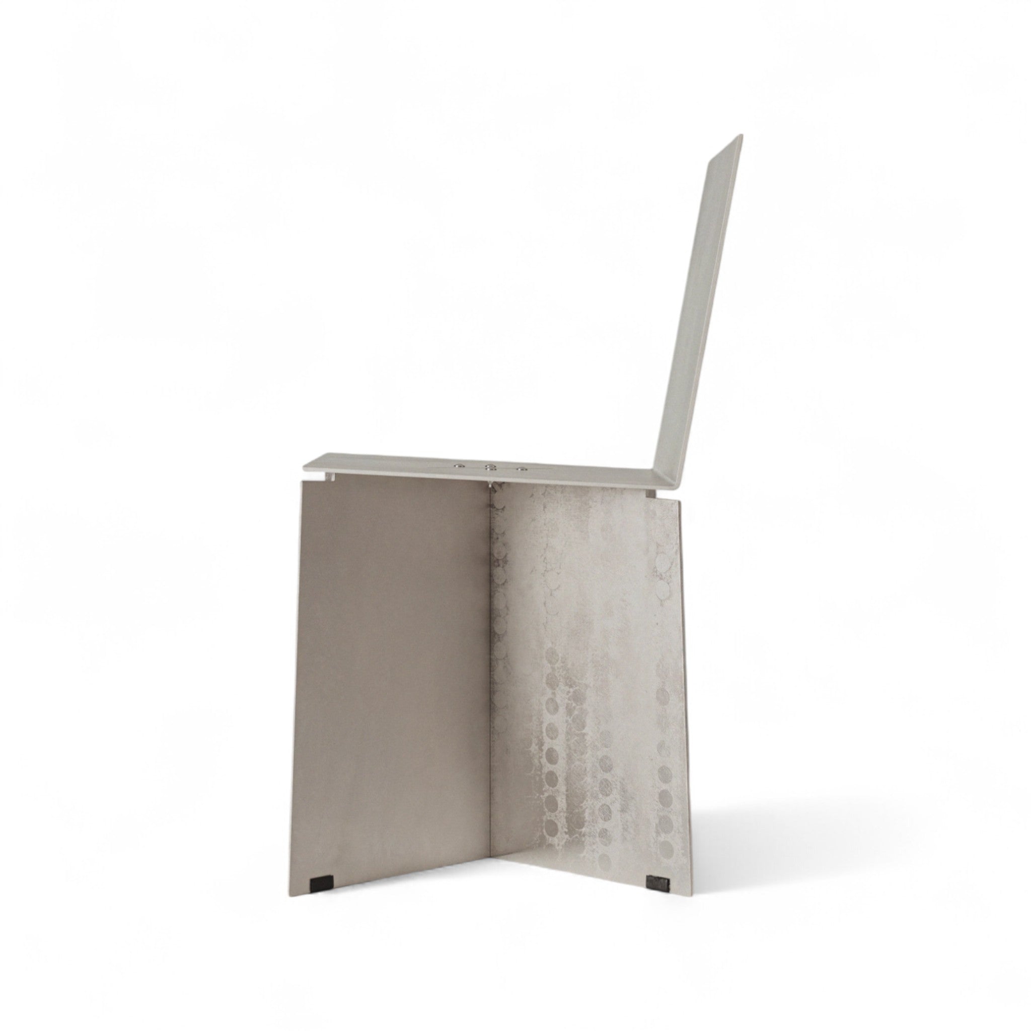 Seine Form wird durch eine subtile Neigung der Sitzfläche und eine gebogene Rückenlehne definiert, die ein Gleichgewicht zwischen struktureller Festigkeit und ergonomischem Komfort schafft. Die Aluminiumoberfläche bleibt unbehandelt – natürliche Kratzer, Spuren und Unregelmäßigkeiten sind Teil des Designs und tragen im Laufe der Zeit zur Entwicklung einer individuellen Patina bei. Für die Montage sind keine zusätzlichen Werkzeuge erforderlich; der Stuhl lässt sich mit wenigen Schrauben einfach zusammensetzen.