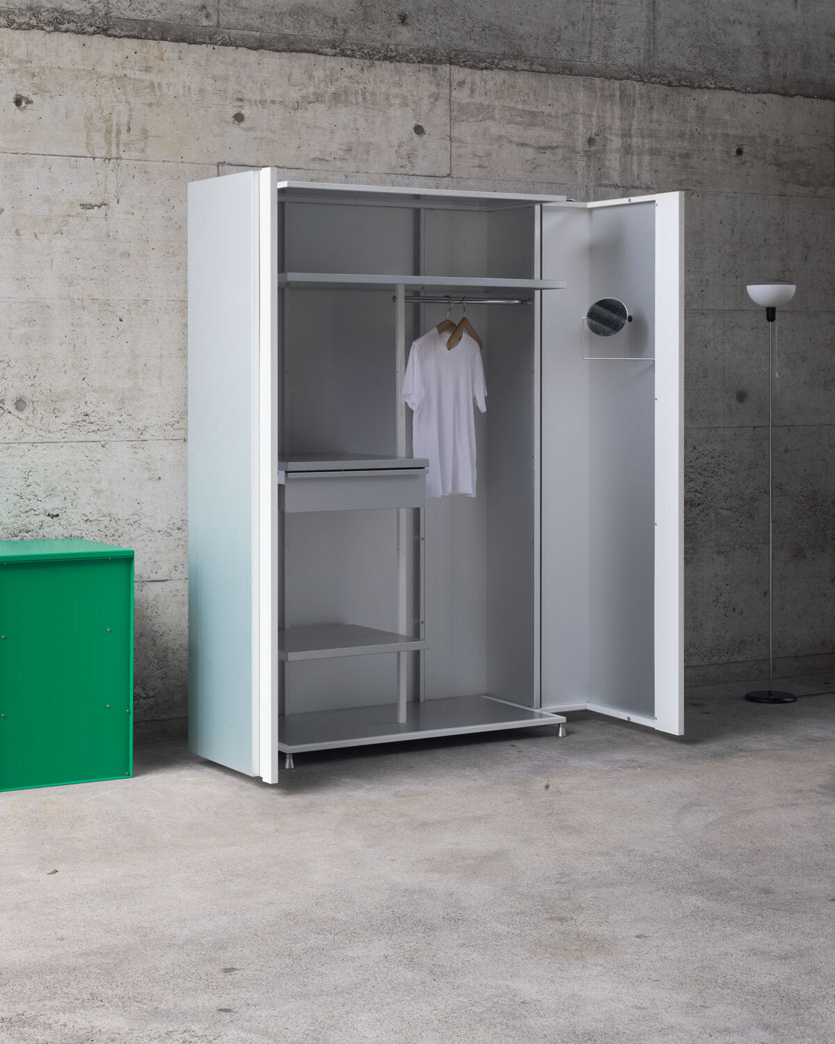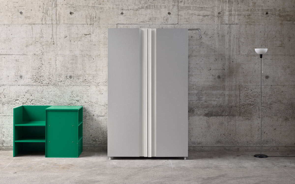 Der Haïku Kleiderschrank war Frédéric Dedelleys erster Entwurf für Lehni. Mit seiner schlichten, klaren Form passt er in jedes Interieur und verbindet Arbeits- und Wohnbereich. Der aus Aluminium gefertigte Schrank ist für sein Volumen überraschend leicht. Sein großzügiger Innenraum besticht durch eine durchdachte Raumaufteilung mit versteckten, praktischen Elementen. Die einzigartigen Ecktüren vermitteln das Gefühl, mitten im Schrank zu stehen.
