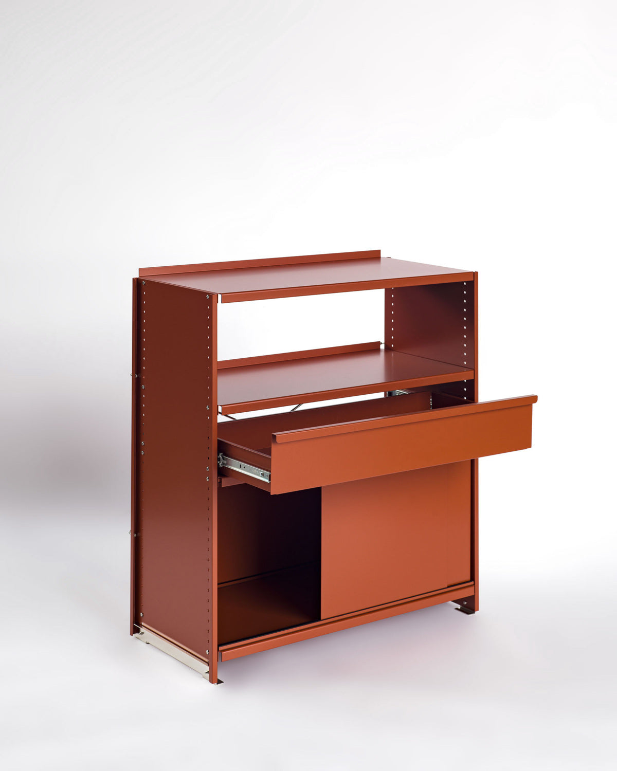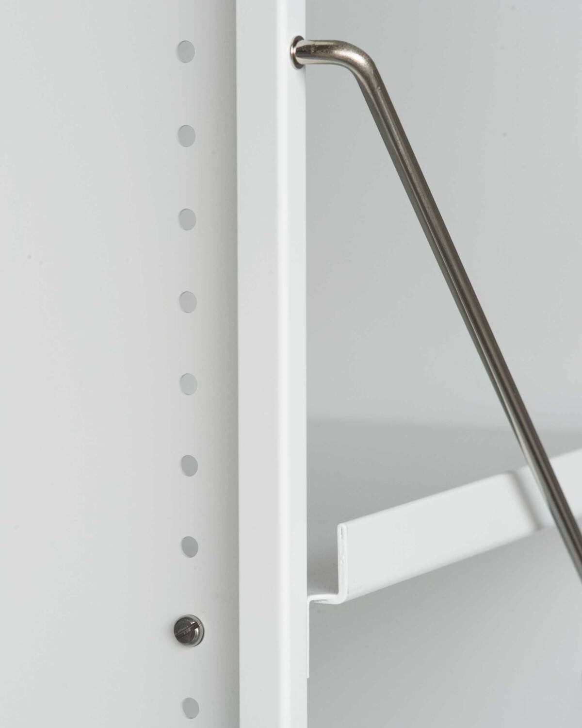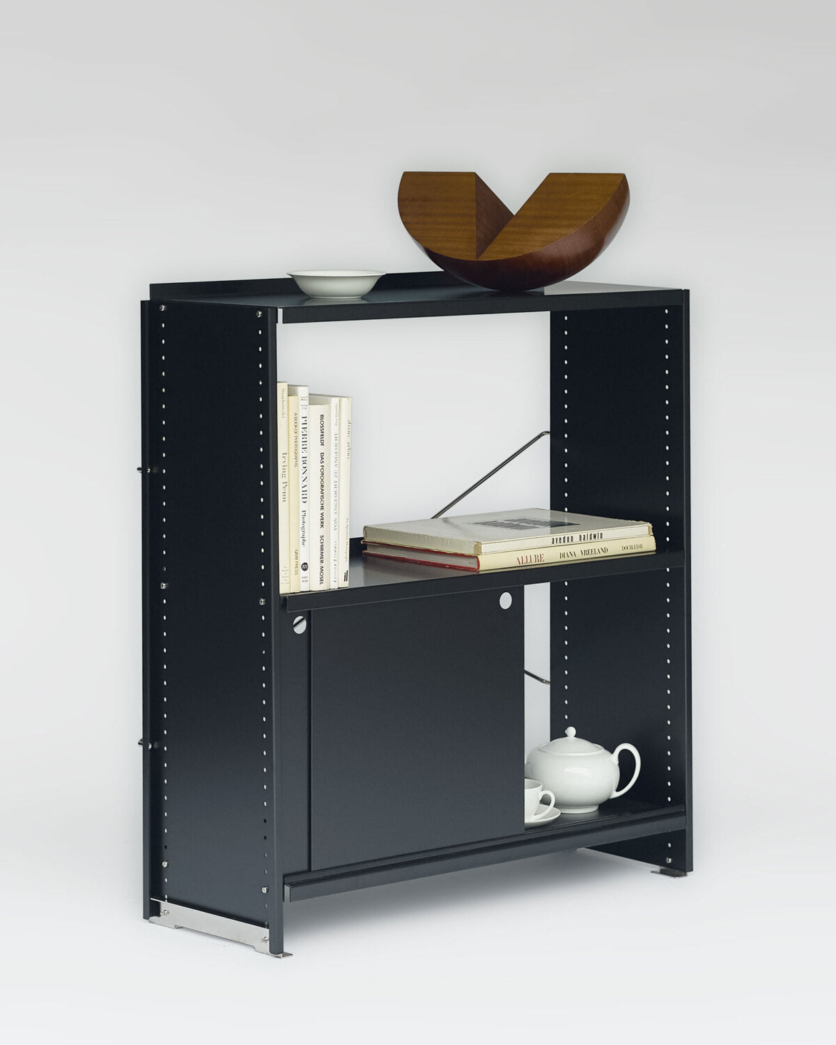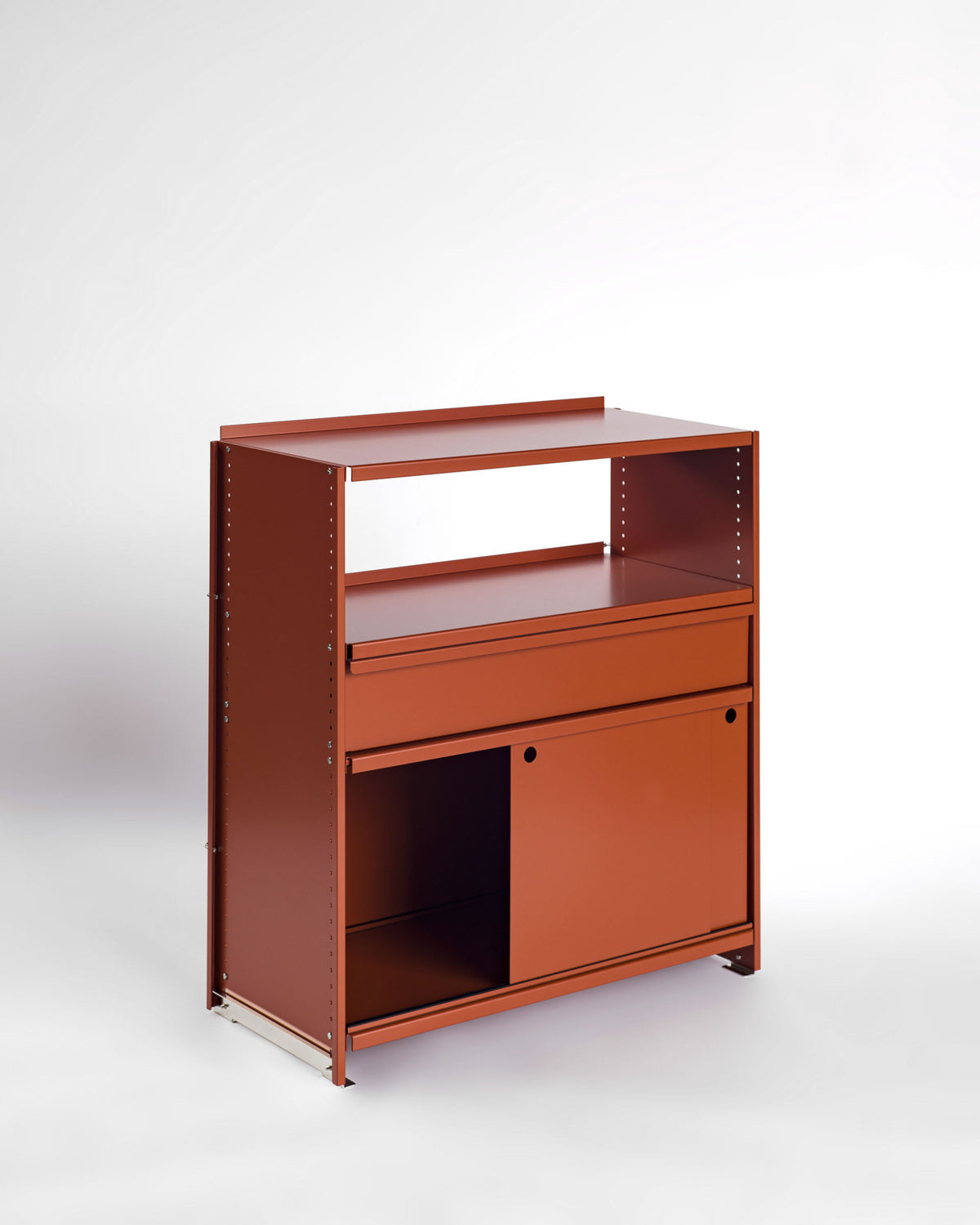 Was wie ein eigenständiges Element wirkt, ist in Wirklichkeit Ausdruck der modularen Intelligenz des Systems. Die Konsole besteht aus leichten, aber robusten gebogenen Aluminiumblechen und wird durch eine charakteristische Querstrebe stabilisiert. Sie trägt die gleiche DNA wie die kompletten Regalkonfigurationen.