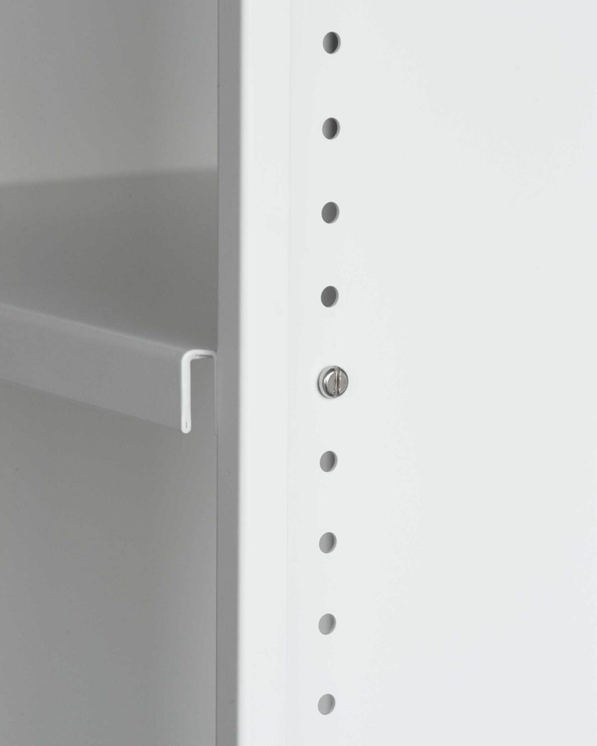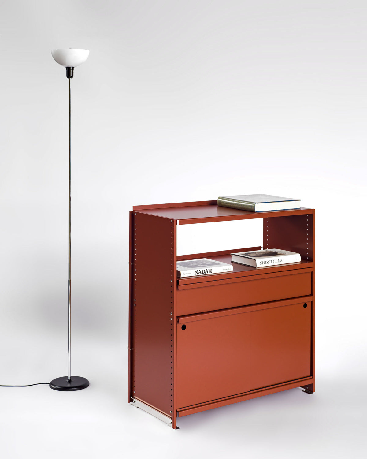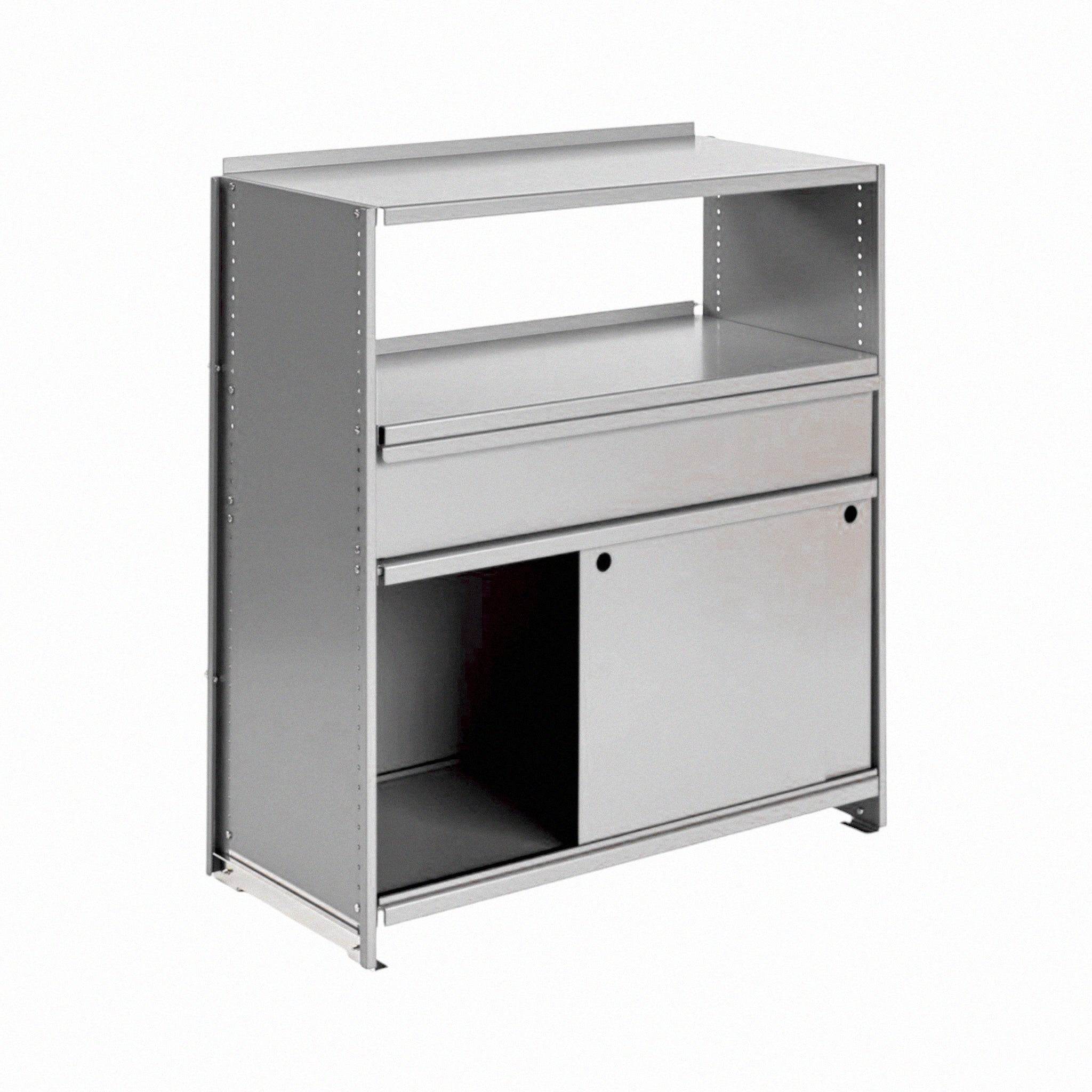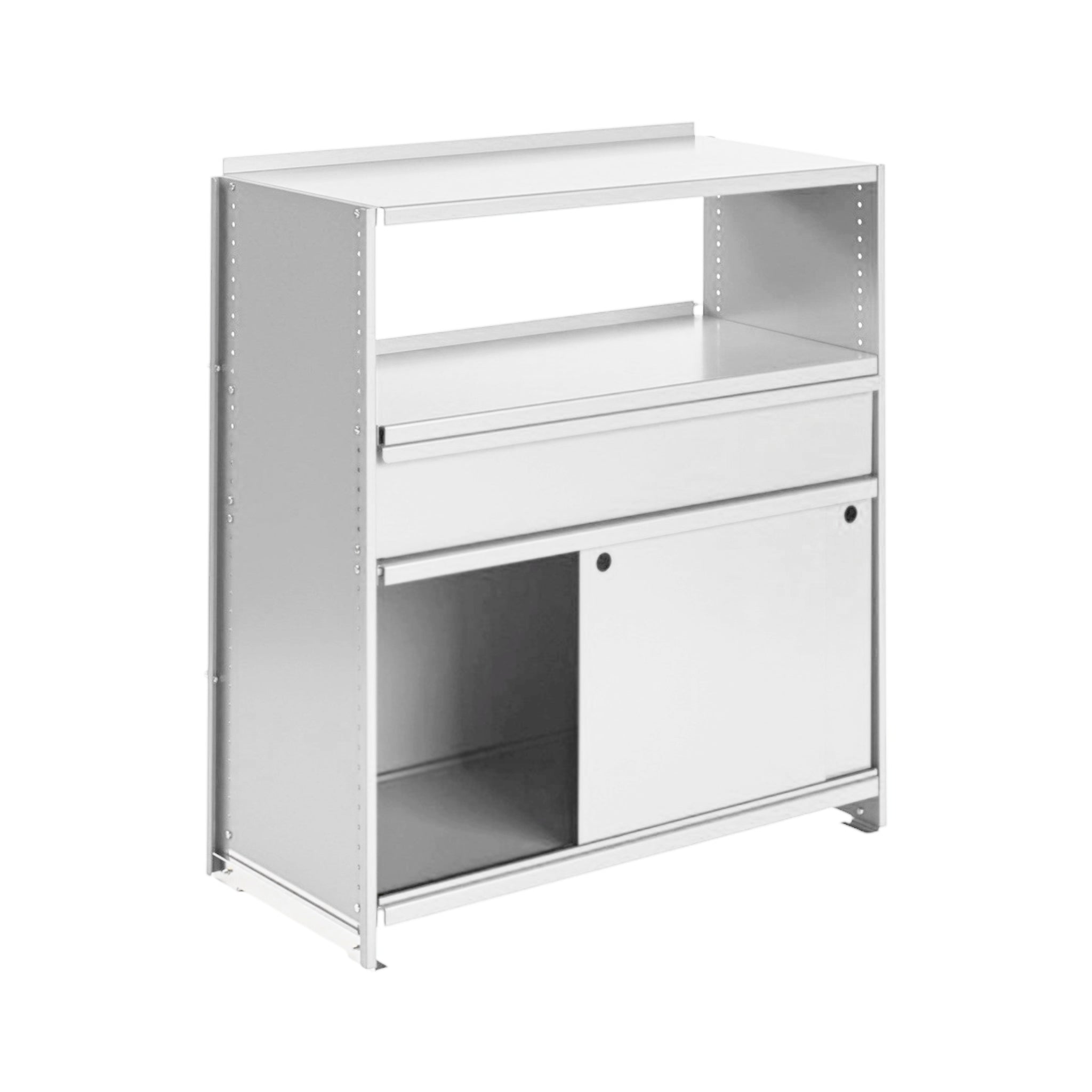 Was wie ein eigenständiges Element wirkt, ist in Wirklichkeit Ausdruck der modularen Intelligenz des Systems. Die Konsole besteht aus leichten, aber robusten gebogenen Aluminiumblechen und wird durch eine charakteristische Querstrebe stabilisiert. Sie trägt die gleiche DNA wie die kompletten Regalkonfigurationen.