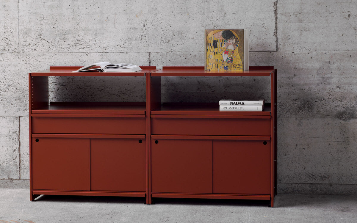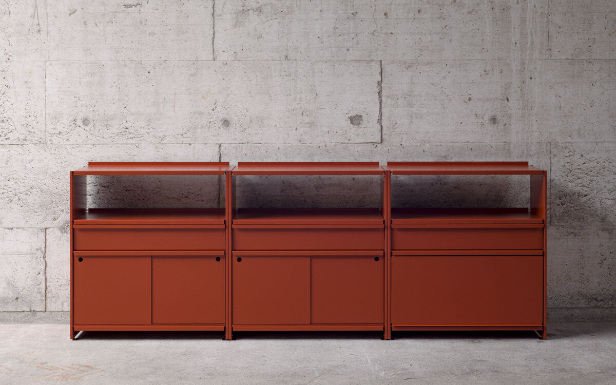 Diese spezielle Konfiguration umfasst zwei Schiebetüren (25 cm Höhe) und eine Schublade (15 cm Höhe). Andere Konfigurationen und Farben auf Anfrage.