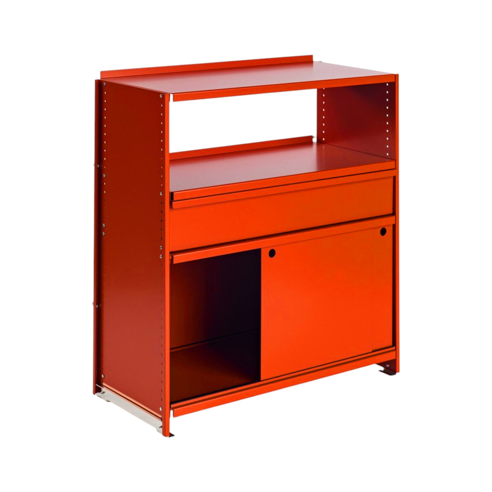 Diese Konsole mit Schiebetüren und Schublade ist eine raffinierte Komposition innerhalb des ikonischen Aluminium-Regalsystems von Andreas Christen. Das System, das erstmals für die Schweizer Landesausstellung 1964 entwickelt und 1970 von Lehni in Produktion genommen wurde, gilt heute als Meilenstein der Schweizer Moderne.
