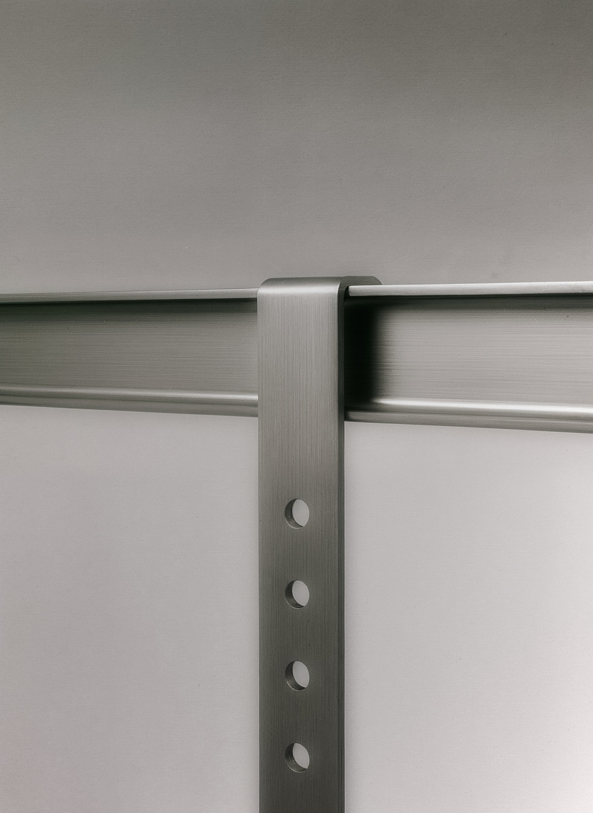 Überarbeitet in rohem, poliertem Stahl, offenbart jede Oberfläche ihren Entstehungsprozess: die Polierspuren, die Maserung, die unauffälligen Unvollkommenheiten. Jeder Ständer wird zum Unikat – ein Objekt, das eher von Produktion als von Perfektion zeugt.