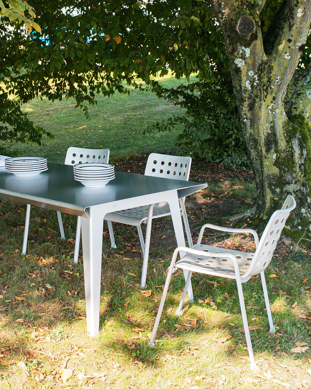With its basic shape, simple and lightweight construction, and materialisation in corrosion-resistant sheet aluminium with open corners, the Aluminium Table 2 by Andreas Christen is a prototypical "Lehni-Christen design". It can be used both as a dining table and a work desk and its unobtrusive simplicity make it suitable for both indoor and outdoor use. Due to the profiles on the underside, the table is completely stable despite its light weight. The plug-in legs are quick and easy to assemble. Accordingly, the Aluminium Table 2 can be easily carried and stowed away. Since it’s also weather resistant, it also makes for the perfect garden table.
