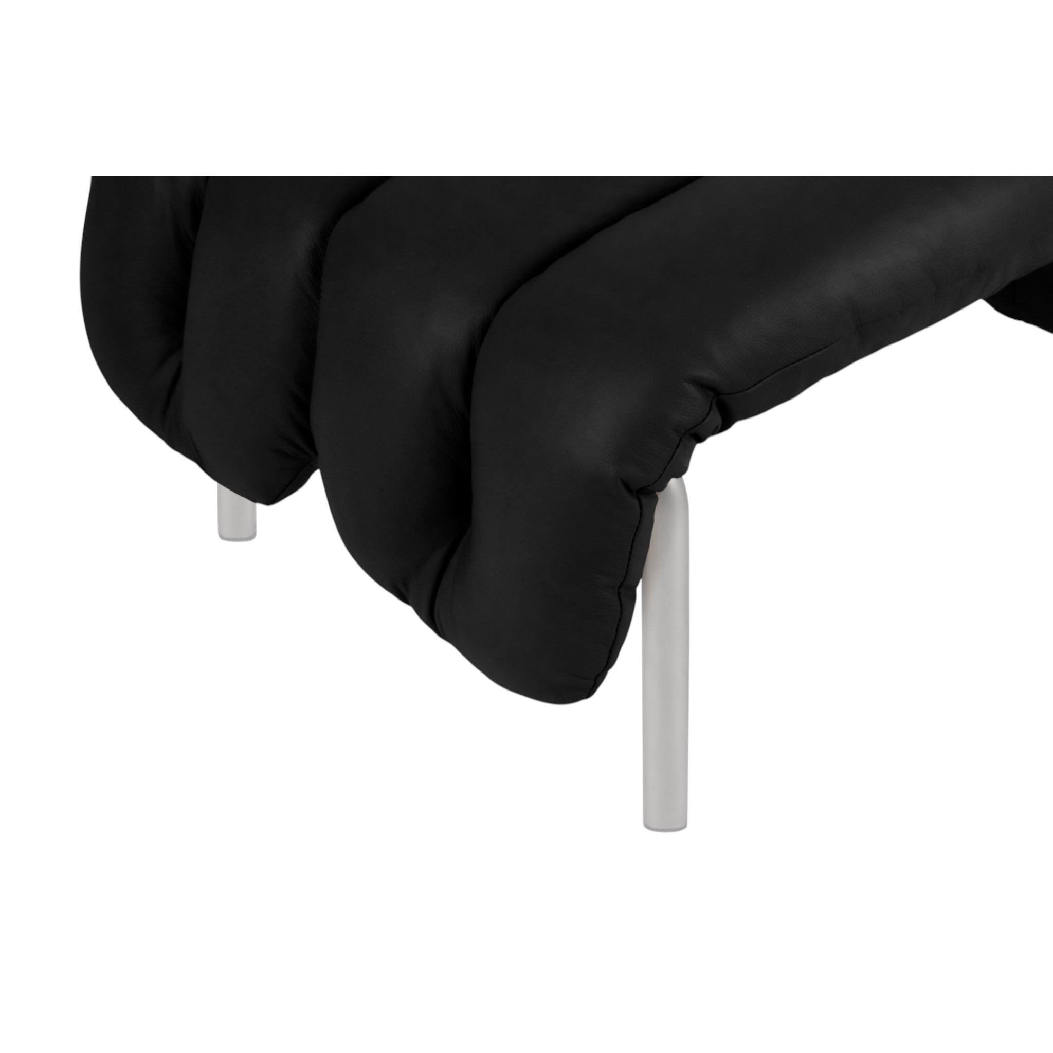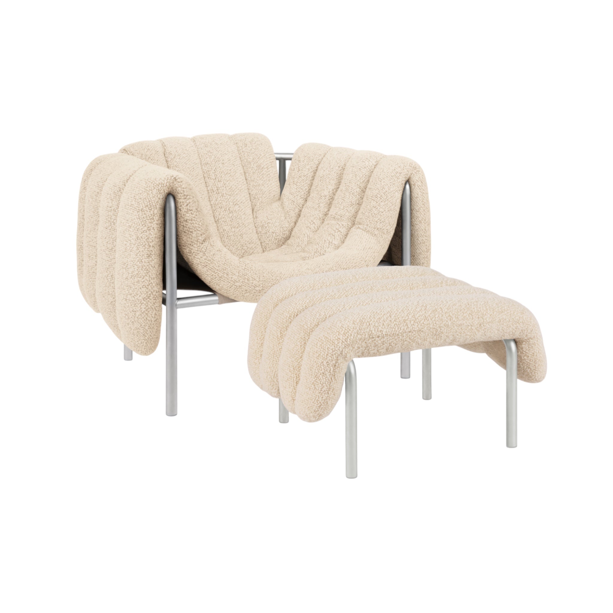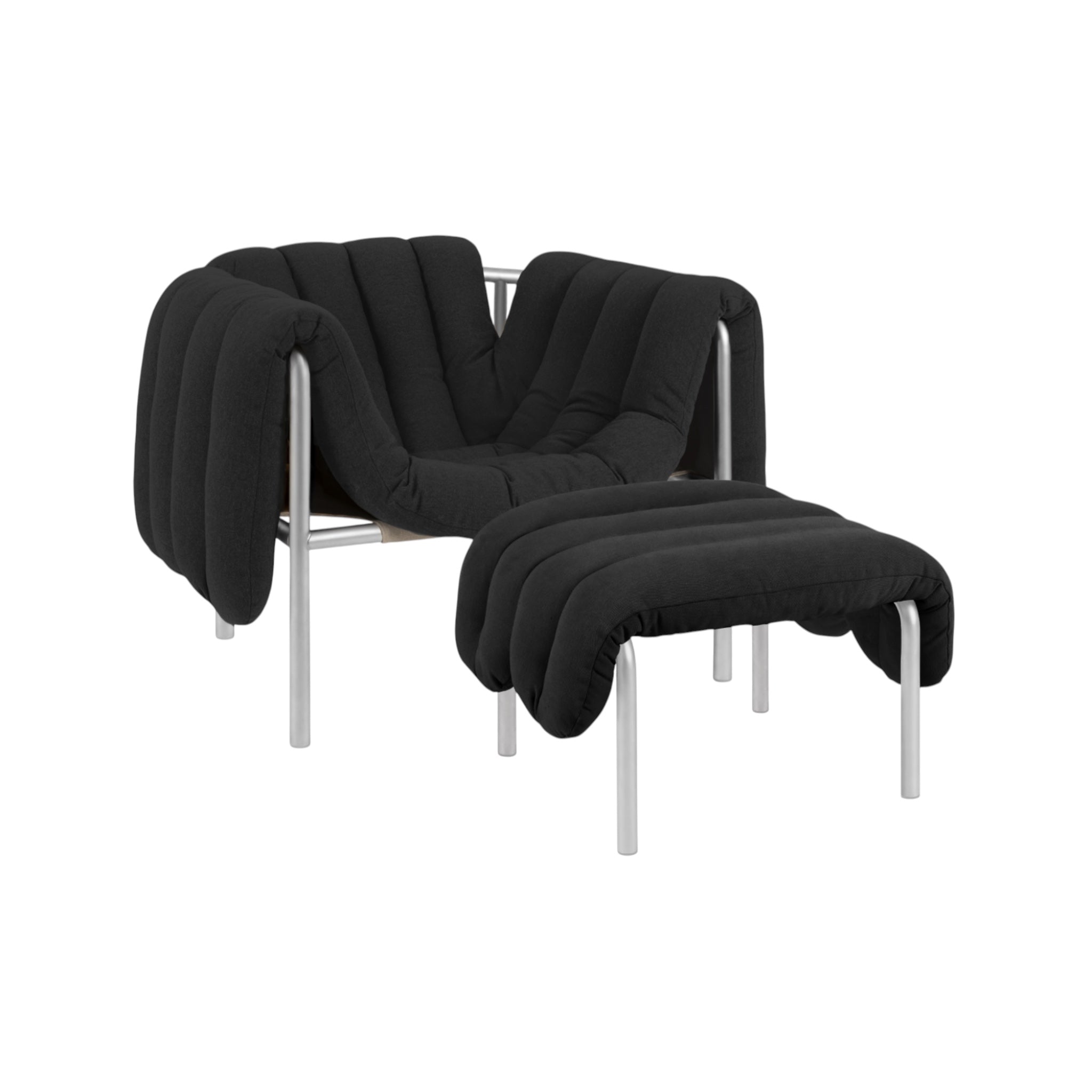 The detachable upholstery of the Puffy Lounge Chair is fat and plump, its generous shape spills freely over the sides of a tubular steel frame which, in stark contrast, is hard-lined and strong. The two key elements of this seating design by Faye Toogood are in purposeful and playful juxtaposition. The elementary frame is inspired by the rational structure of classic modernist design, whilst the extravagant quilt-like upholstery warmly embraces and envelopes, is comforting and reassuring. The Puffy Chair frame is available in powder-coated or sand-blasted steel finishes and a choice of thick canvas, chunky bouclé or luxurious leather upholstery.