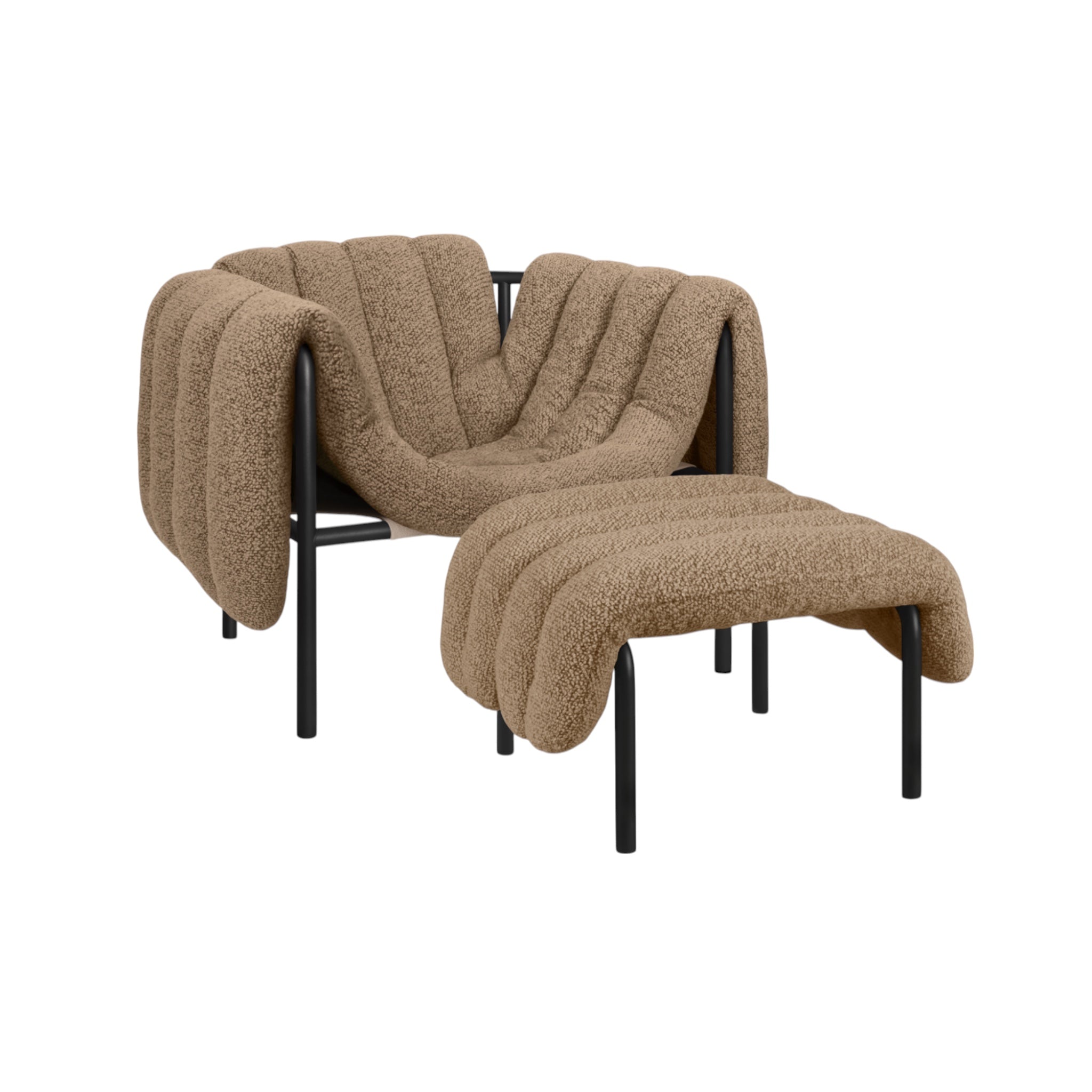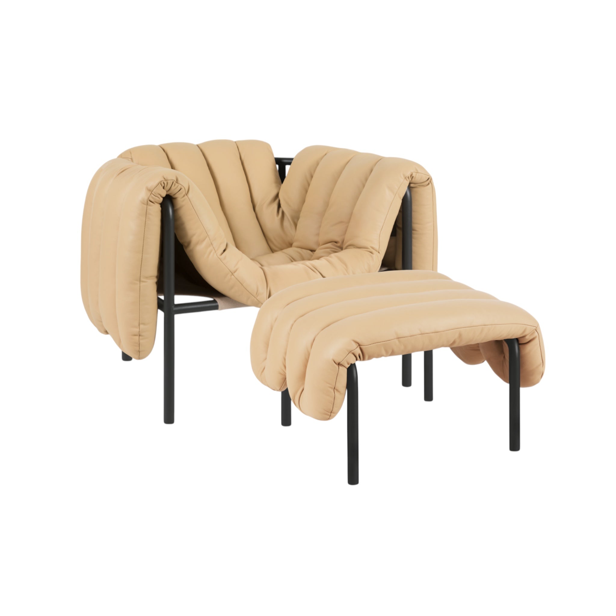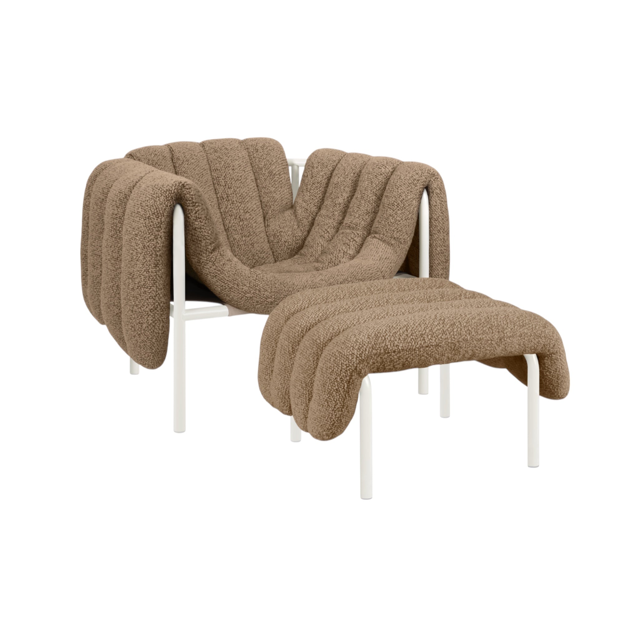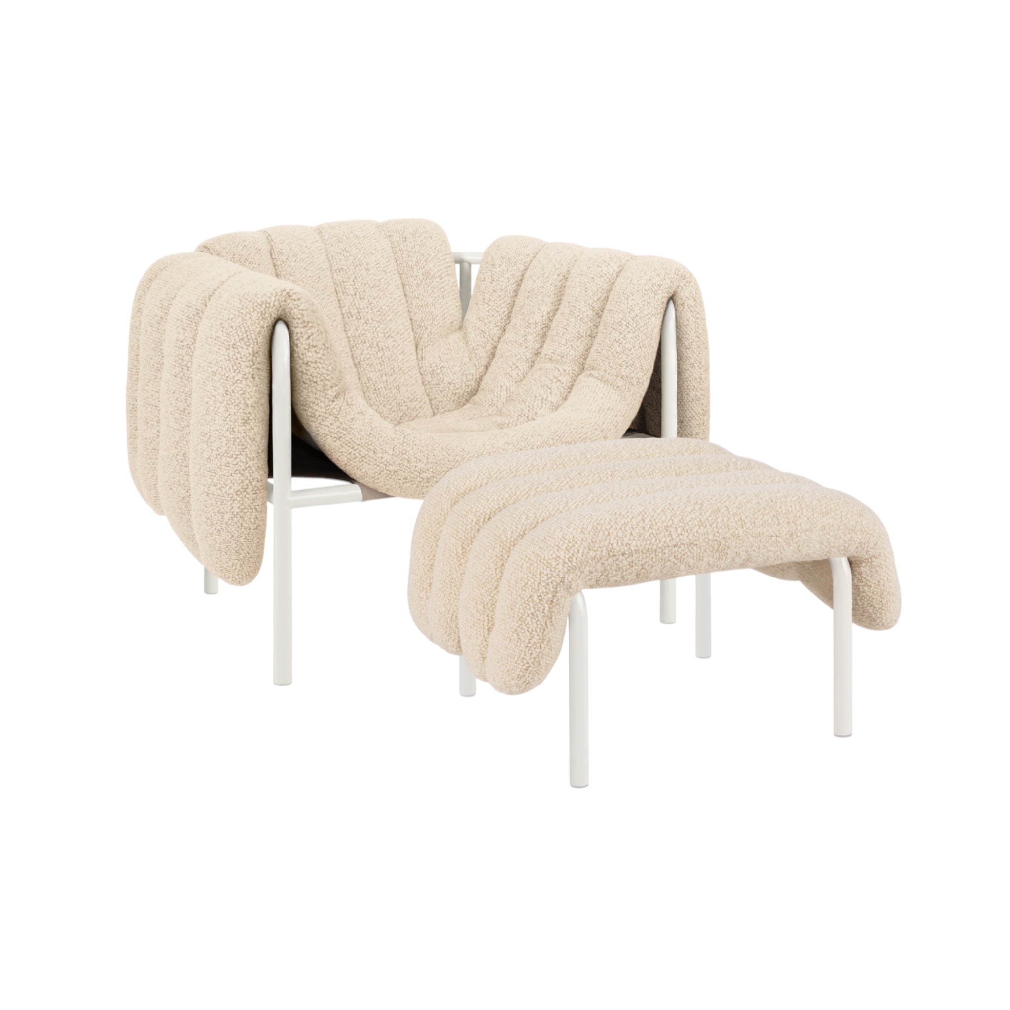 The detachable upholstery of the Puffy Lounge Chair is fat and plump, its generous shape spills freely over the sides of a tubular steel frame which, in stark contrast, is hard-lined and strong. The two key elements of this seating design by Faye Toogood are in purposeful and playful juxtaposition. The elementary frame is inspired by the rational structure of classic modernist design, whilst the extravagant quilt-like upholstery warmly embraces and envelopes, is comforting and reassuring. The Puffy Chair frame is available in powder-coated or sand-blasted steel finishes and a choice of thick canvas, chunky bouclé or luxurious leather upholstery.