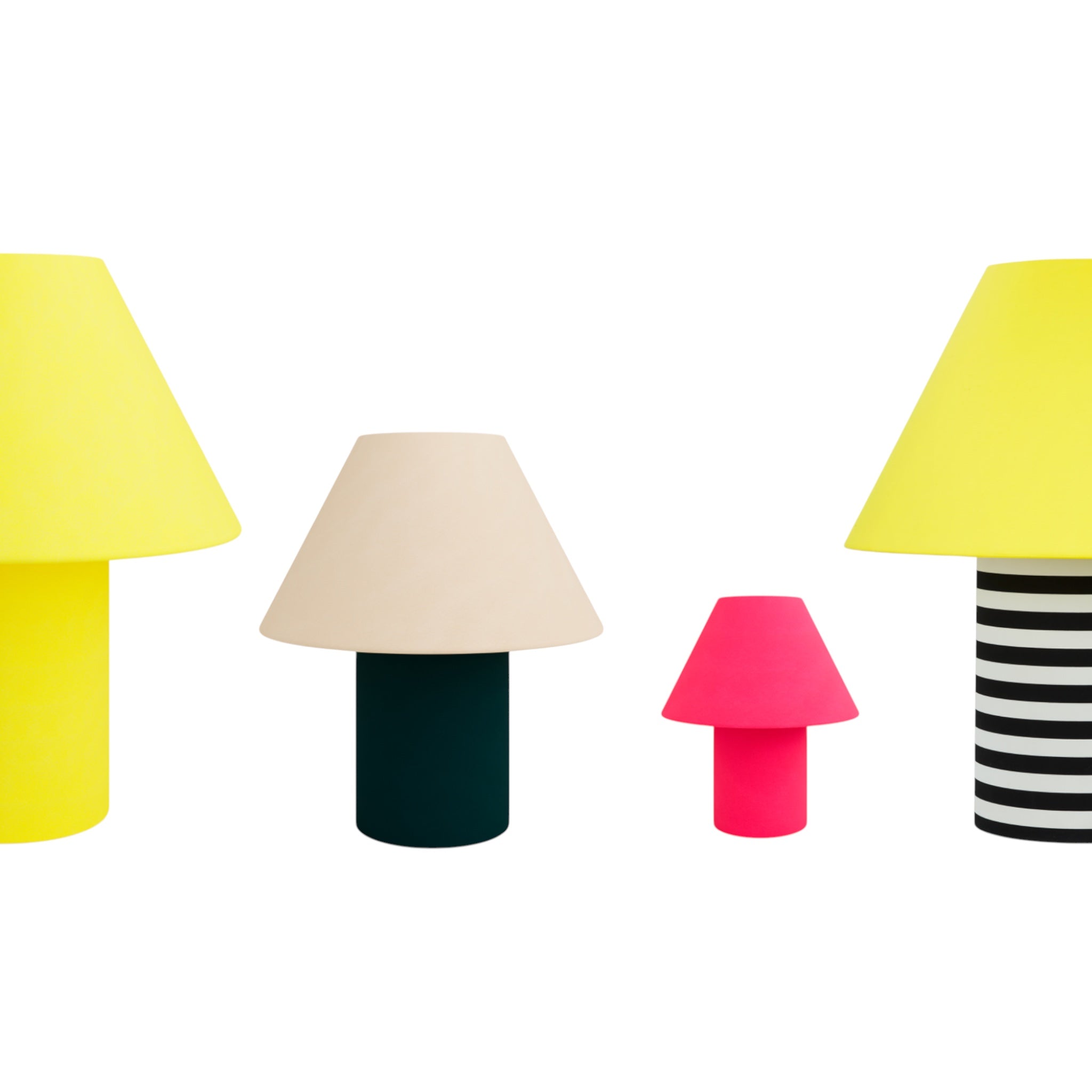 Toto is an irrepressible burst of color and light. Its silhouette is that of an archetypal lamp, all-angled shade and a chunky base. But that is where the familiarity ends. Toto is entirely covered from textile as a playful extension of the classic lampshade itself. Material uniformity, coupled with vivid color and graphic pattern, lends the lamp a cartoonish presence. So does exaggerated scale; the Toto Large lamp is blown up, jumbo, never-to-be-ignored, visually giant yet physically light, while Toto Small’s tidy and diminutive size is more than a bit charming. With Toto, Fabien Cappello has designed a joyful, covetable depiction of a lamp. Customers can choose their own combination for shade and base in both Toto Large and Medium variants. Toto Small is available in block colors only.