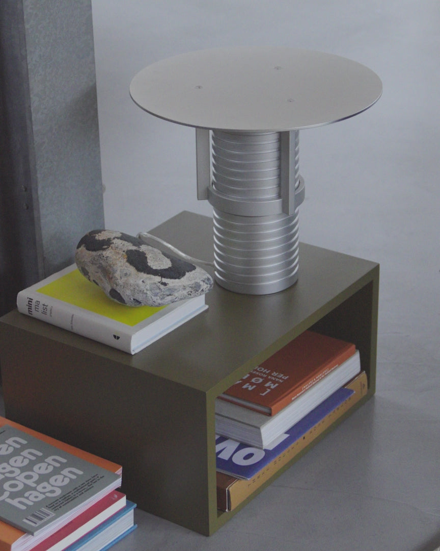 With its distinctive blend of industrial and sculptural design, the Set Lamp features an upward-facing light that shines through an aluminum shade, emitting a bright yet indirect glow. The lamp's adjustable shade height, facilitated by threads on the body, allows for a tactile rotation and enables personalized changes in angle and light intensity. This unique lamp exudes character and seamlessly blends into a variety of spaces—whether placed on the floor, windowsills, sideboards, or any preferred location—making a bold statement as a distinctive centerpiece.