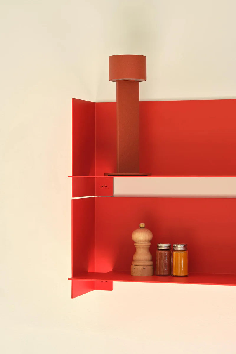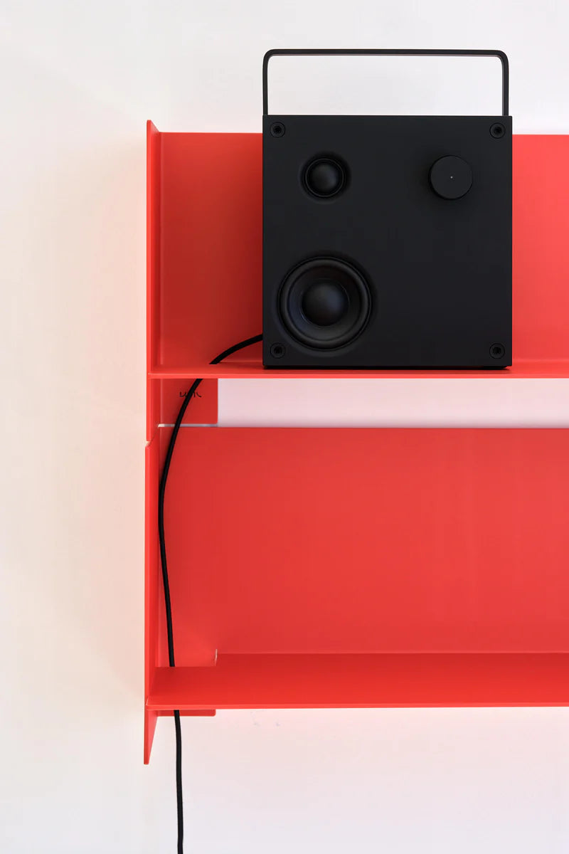 The Palco Wall Shelf combines a vibrant backdrop with a practical storage solution for books and personal items. Formed from a single sheet of aluminum, its design emphasizes production efficiency and minimizes material waste.