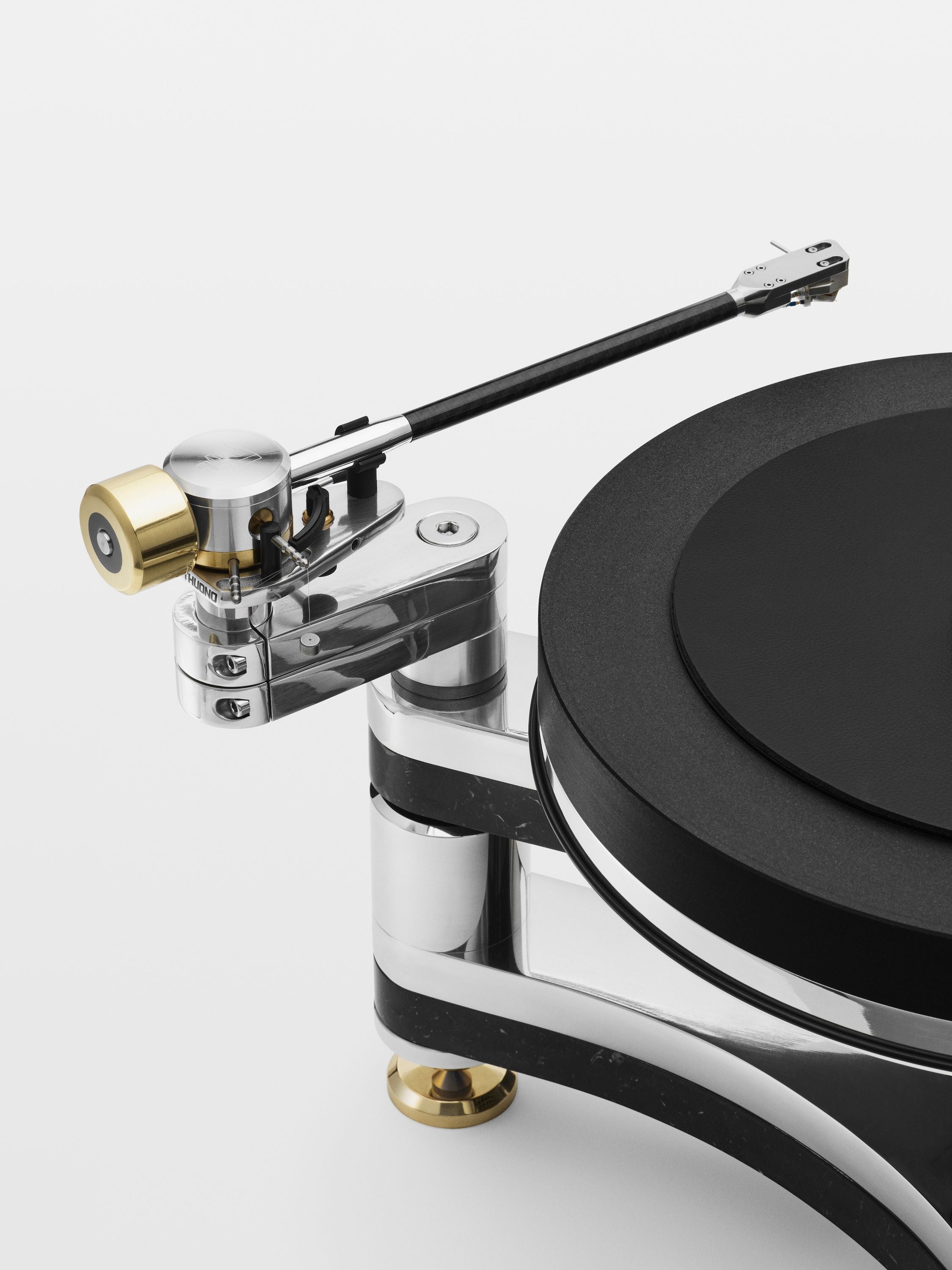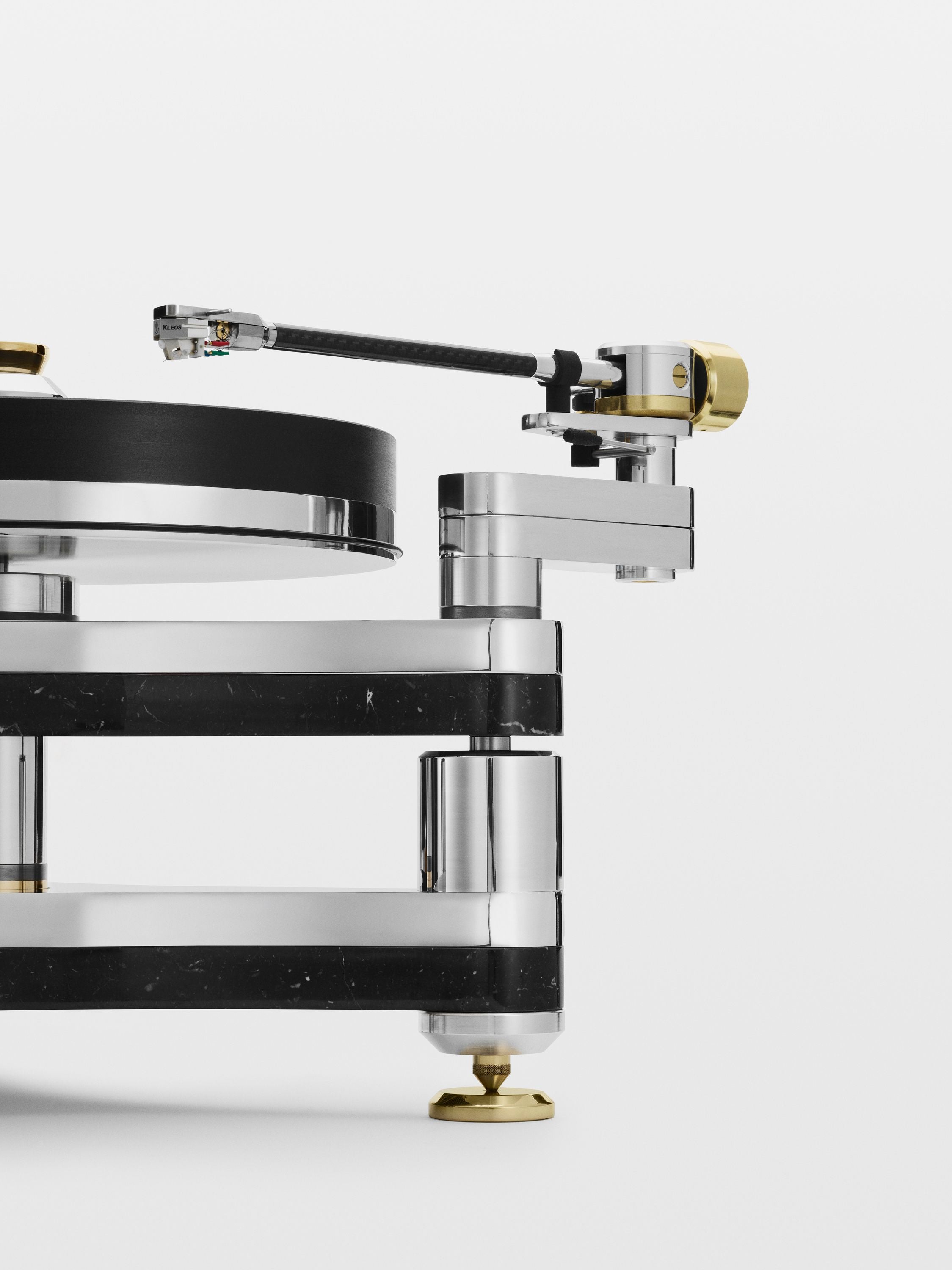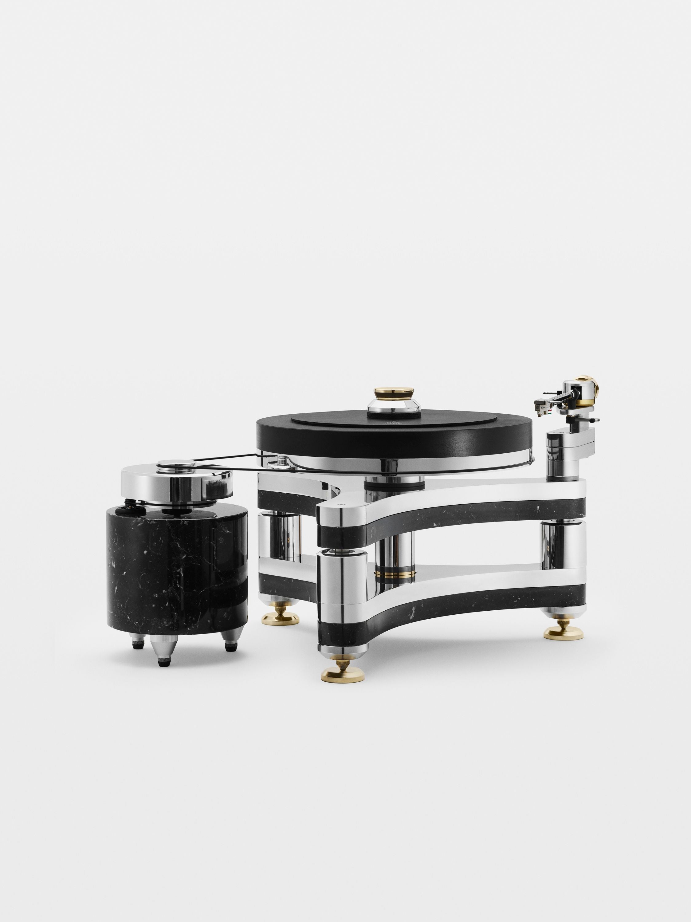 Built from Nero Marquinia marble and aluminium, the chassis provides mass and rigidity. Key components—platter bearing, flywheel, tonearm mount—are structurally isolated to minimize resonance and improve transient response, producing an expansive, focused soundstage.